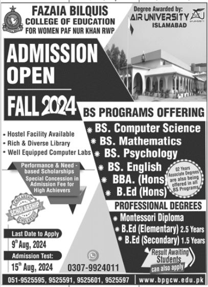 Fazaia Bilquis College of Education for Women FBCEW PAF Nur Khan Rwp, affiliated with Air University, has announced that Admissions are Open for 2024. This announcement is for a variety of esteemed undergraduate programs, including BSCS, BS Mathematics, BS Psychology, BS English, BBA Hons, and B.Ed Hons.