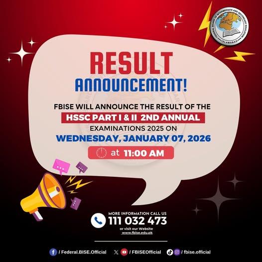The education board will upload the detailed information of the intermediate class result online and the students are asked to visit the official website of FBISE Islamabad to get the result updates. The board has announced that the result will be declared on 07-01-2026 at 11:00 am in the morning time.