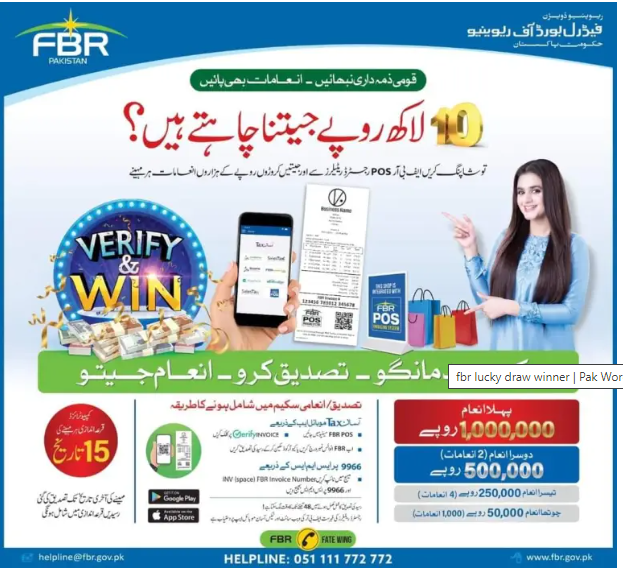 FBR has introduced the system for the shops, which will charge Rs 01 extra on their total bill and the amount of Rs.53 million will be distributed to FBR Lucky Winners and after that every month, FBR lucky draw will be managed every month. the people can try their luck as Federal Board of Revenue will distribute prize money among 1007 lucky winners every month.
