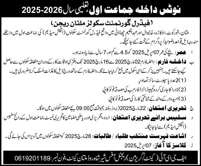 Federal Government Schools Courses Admissions Notification 2025