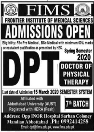 Frontier Institute of Medical Sciences Admission 2020 announced for the class of DPT Doctor of physical Therapy. The last date of submission of Admission form is 15th march, 2020.