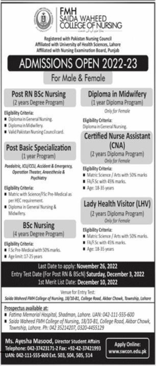 FMH Saida Waheed College of Nursing admission 2022