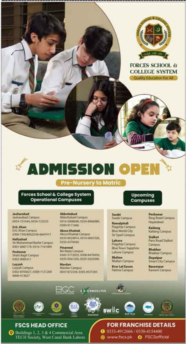 Forces School & College System Lahore is intended to open Admissions and looking for Applications to interested parents for Admissions in Class Pre-Nursery to Matric for Academic Session 2021-2022. Students will learn under learning and comfortable environment. Candidates may apply, Admissions are open for Academic Session 2021-2022.