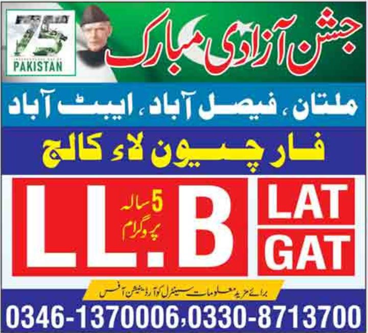 Forchevan Law College has held LLB Admission 2022 with LAT and GAT. The LLB will be 5 years in Law Colleges Multan, Faisalabad and Abbottabad, More information will be collected from Central Coordination Office.