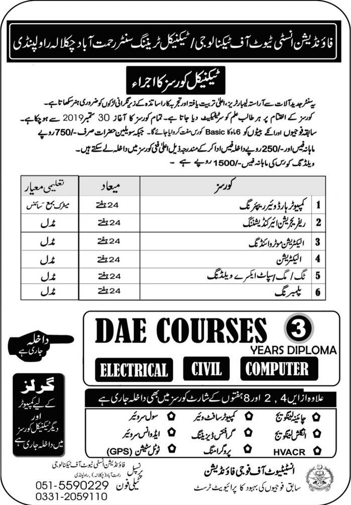 Foundation Institution of technology and technical training program rawalpindi offered admissions in various course including computer hardware, refrigeration air condition, electrician and plumber.