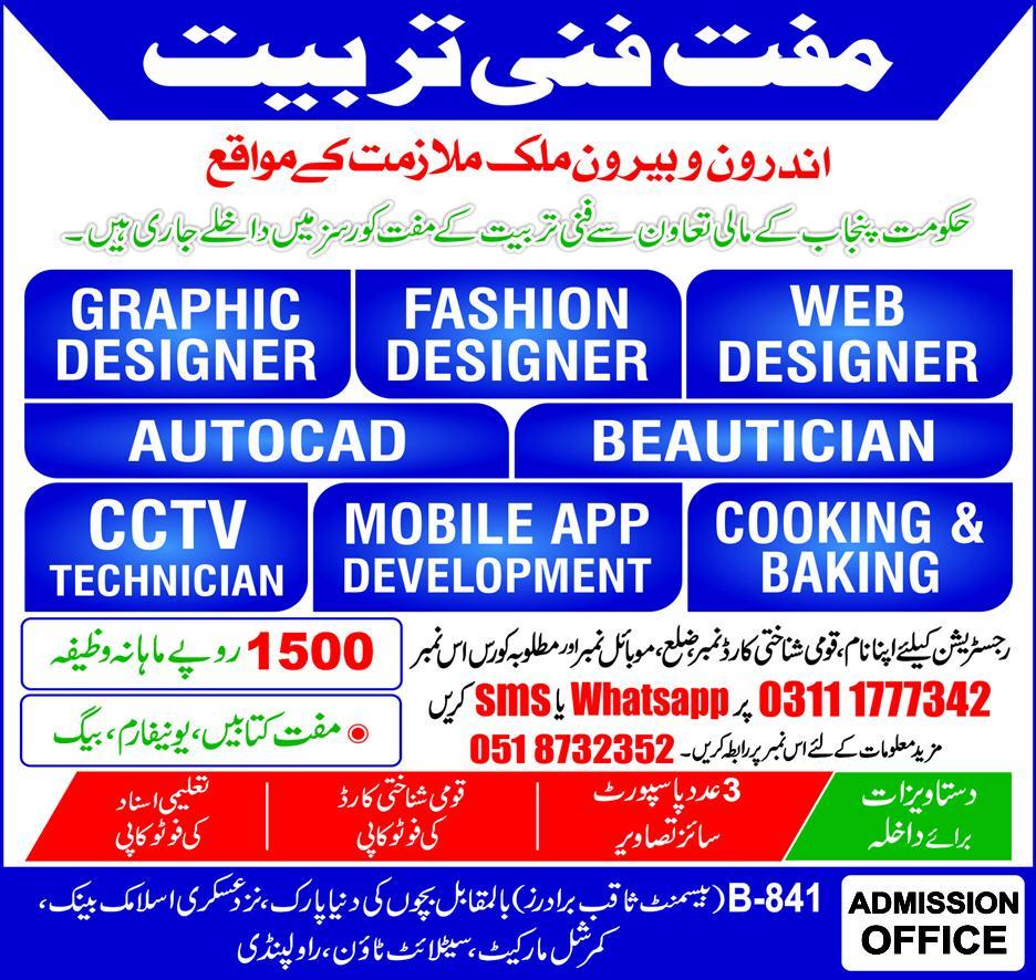 Govt.of Punjab announce Free Technical Training Courses in Graphic Designer, Web Designer, Fashion Designer, Auto Cad, Beautician, CCTV Technician, Mobile App Development, Cooking & Baking. Scholarships are available.