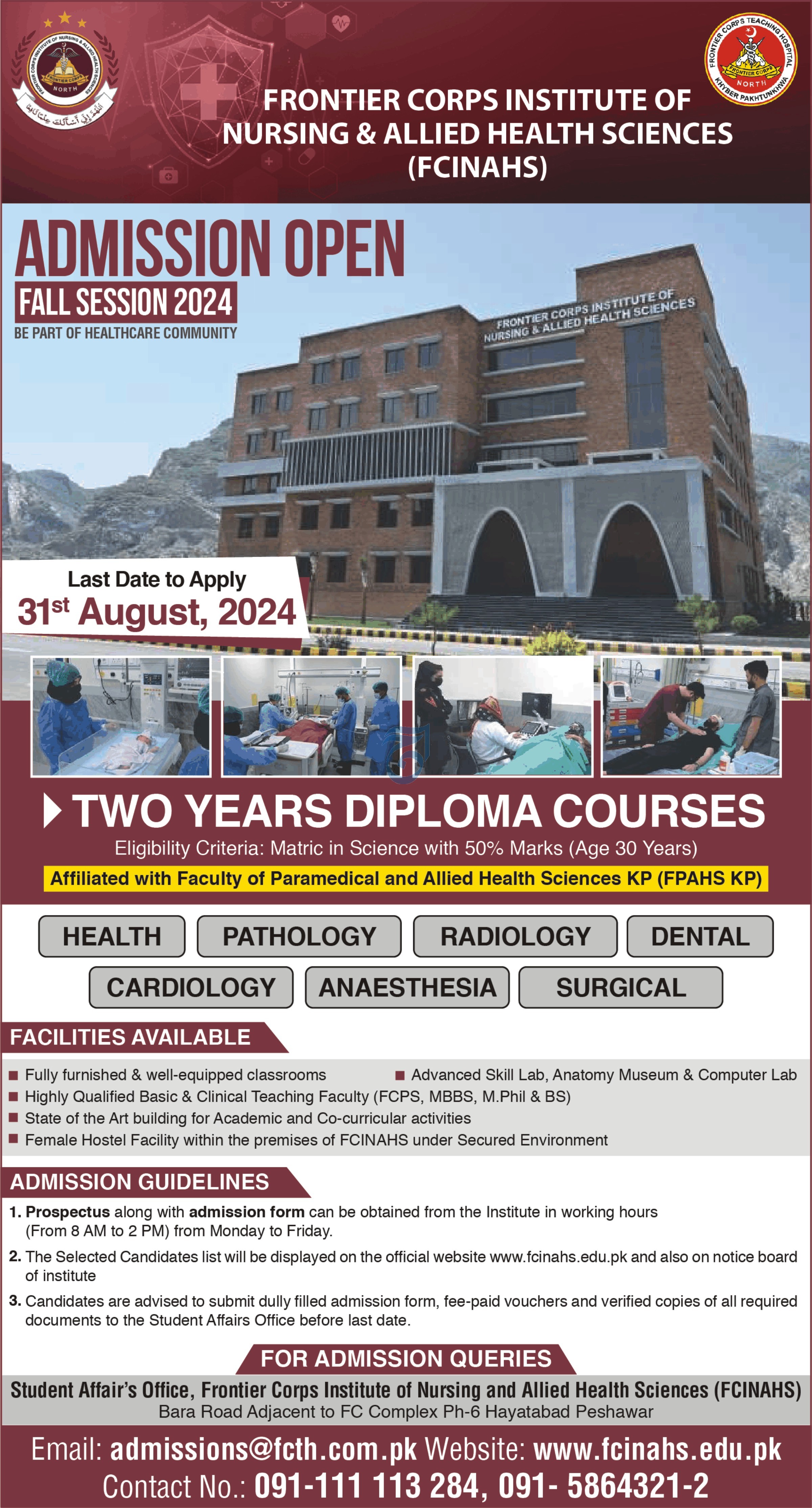 Frontier Corps Institute of Nursing & Allied Health Sciences FCINAHS Peshawar has opened Admissions 2024 for its prestigious 2-Year Diploma Courses. These programs are designed to equip students with specialized skills in various healthcare fields, making them highly sought-after professionals in the medical industry.