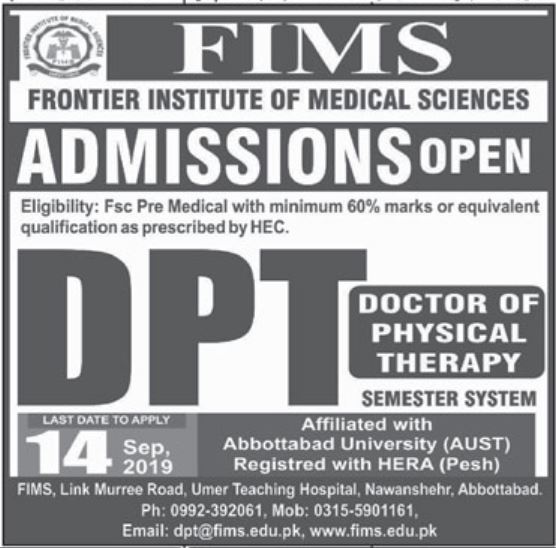 Frontier Institute of Medical Sciences Abbottabad has announced admissions for DPT Doctor of Physical Therapy. FSc with 60% marks are eligible to apply.
