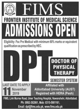 Frontier Institute of Medical Sciences Abbottabad has open admissions for DPT Doctor of Physical Therapy. Semester System. FSc Pre Medical with 60% marks is eligible to apply. Last date for submission of admission application is 11 Nov 2019.