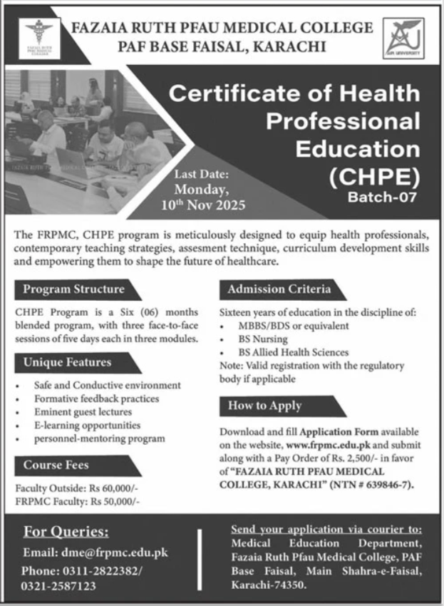 The Department of Medical Education DME at Fazaia Ruth Pfau Medical College FRPMC invites applications for Batch 07 of the Certificate in Health Professions Education CHPE program. This six-month blended course is designed to strengthen the educational and leadership capabilities of healthcare professionals by equipping them with advanced teaching methodologies, assessment techniques, and curriculum development skills — empowering them to play a transformative role in medical education and healthcare delivery.