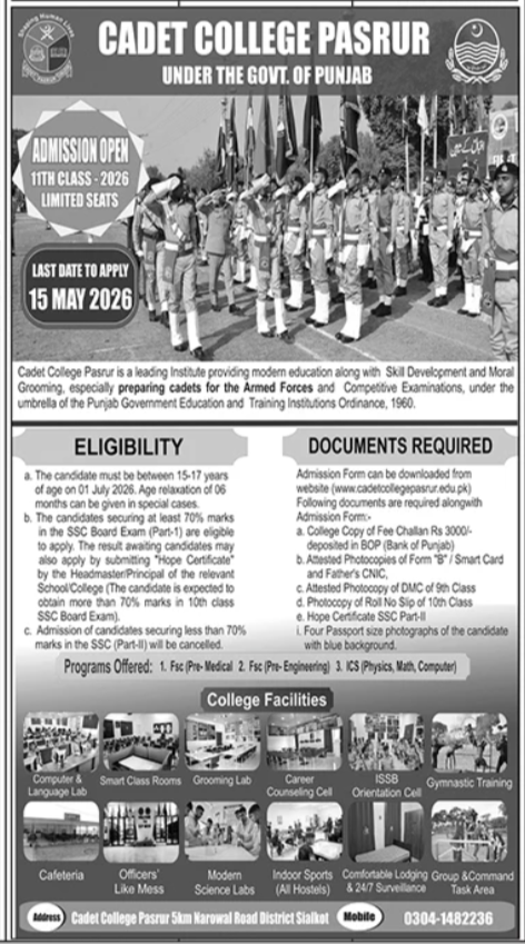 Cadet College Pasrur provides an excellent opportunity for students seeking quality education in a disciplined environment with strong career development support. With limited seats available, eligible candidates are encouraged to apply before the deadline.