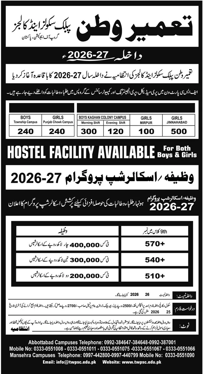 Tameer-e-Watan Pak School & Colleges, a well-known Group of Education in Pakistan, has officially announced the opening of admissions 2026 for the academic session 2026–27. The institution is committed to providing quality education in a secure and disciplined environment, helping students achieve academic excellence and personal growth.