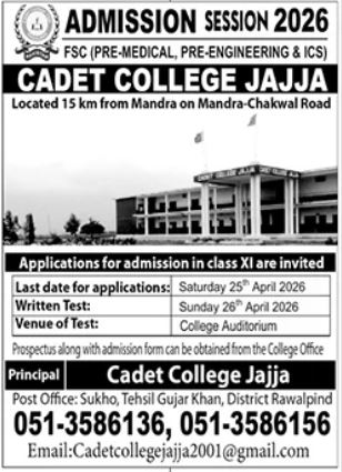 Cadet College Jajja is a well-established residential institution located approximately 15 km from Mandra on Mandra–Chakwal Road, offering a structured academic system combined with character building and disciplined training. The college aims to prepare students for higher education while instilling leadership qualities and responsibility.
