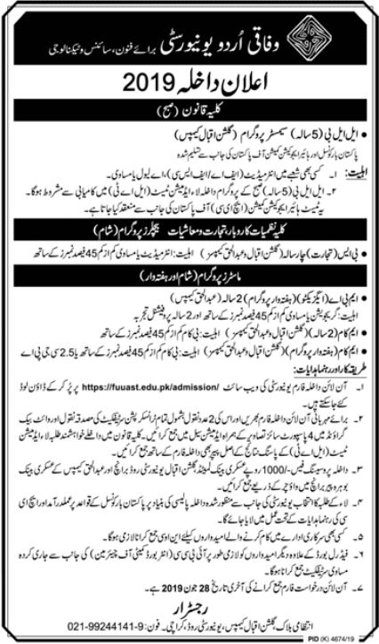 Federal Urdu University Karachi has announced the admissions in various programs. fuuast karachi offred admissions in llb, BS, MBA and M.Com. last date to apply online in 28 June 2019.