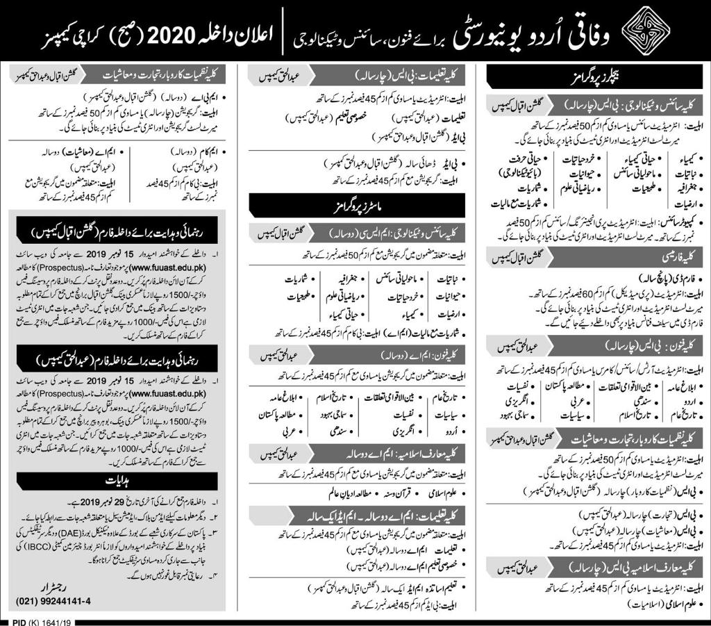 Federal Urdu University of Art Science & Technology Karachi Campuses has offered admissions for BEd, BS in Chemistry, Geography, Environmental Sciences, Animal Sciences, International Relation, Sindhi, Arabic, English, Urdu, MSc in Geography, Accounts, Chemistry, Environmental sciences, MA in International Relations, History of Islam, English, Urdu, Sindhi, Arabic, Pakistan Studies. Last date to apply is 29 Nov 2019.