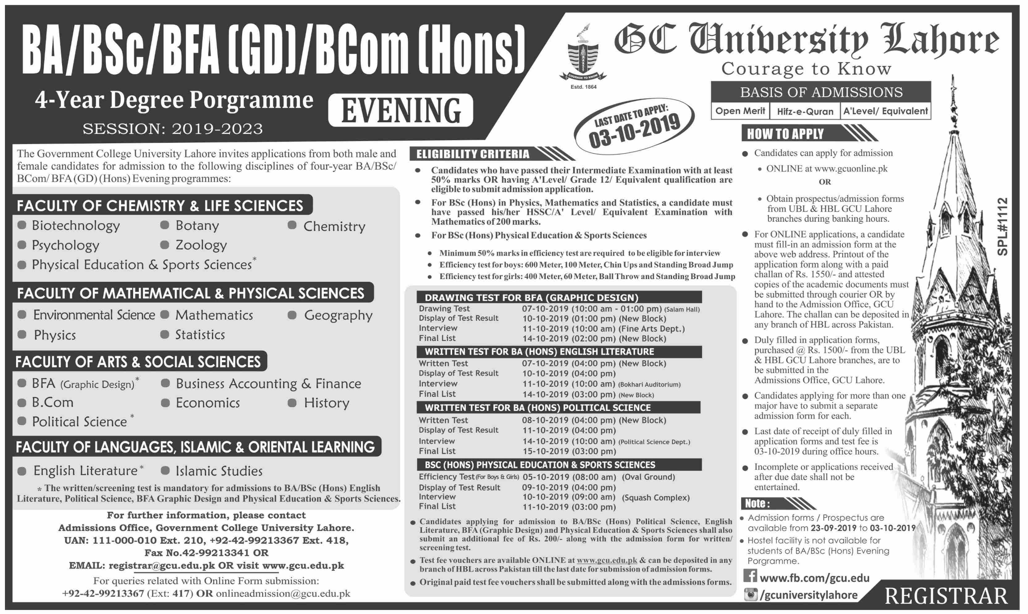 GC University BA BSc B.Com admissions 2019