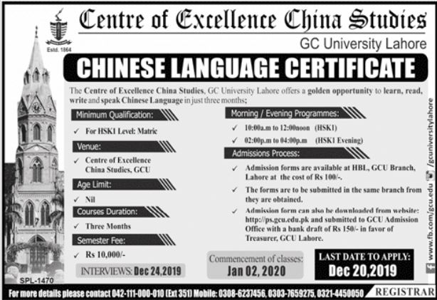 GC University Lahore offers admissions for Chinese Language Certificate. Duration of course will be 3 months. Last date for submission of admission applications is 20 Dec 2019. Commencement of classes will be on 02 Jan 2020.