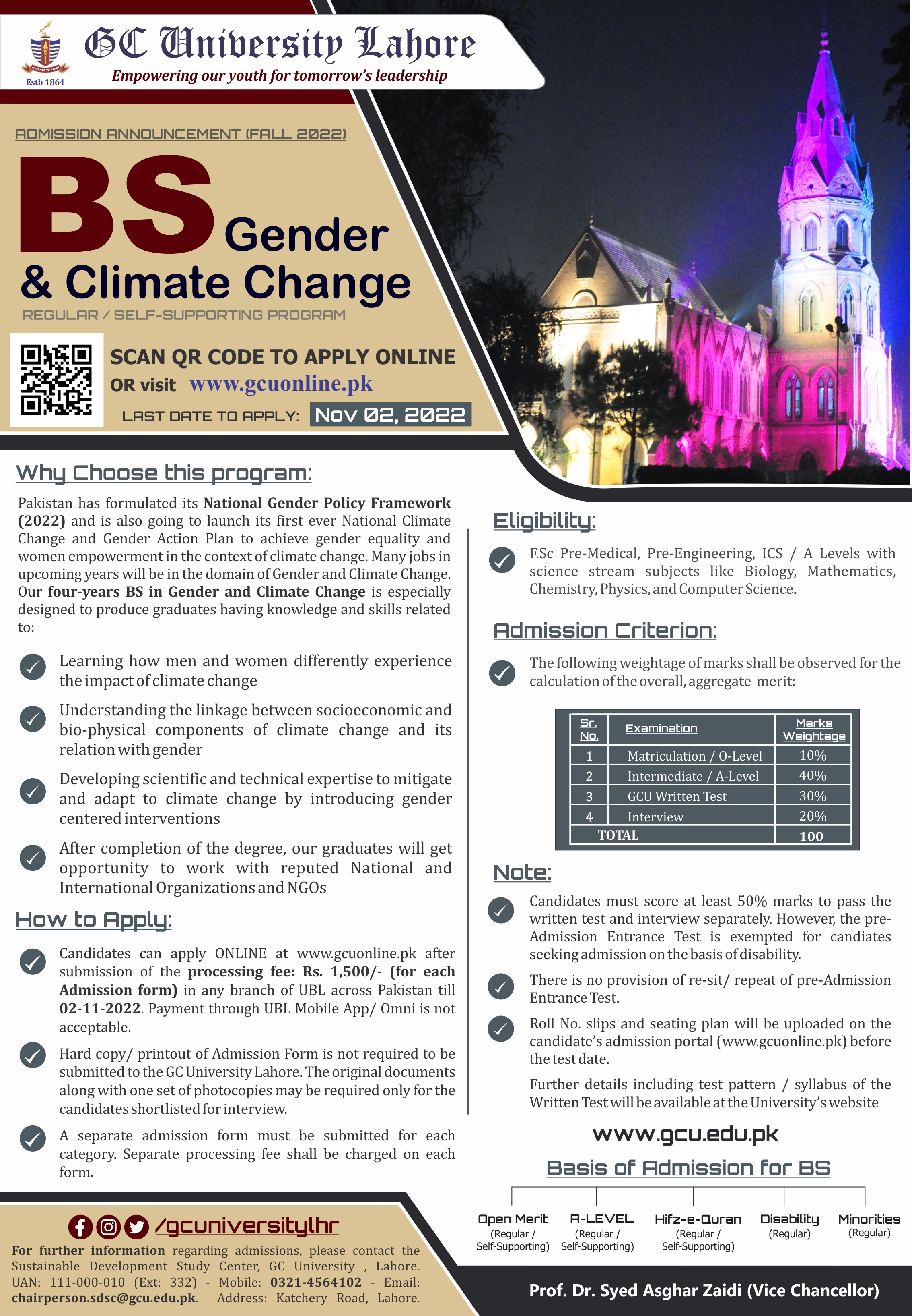 GC University Lahore has advertised admission for the year 2022. GC University Lahore is offering admission for the four year bachelor program of Gender and Climate Change. Those student who want to take admission in this program can visit the appropriate branch for further information, or use their official website to submit an online application as soon as feasible, submit a form before the admission closes i.e Nov 2,2022. This institution has well experienced staff and providing the highest level of education.