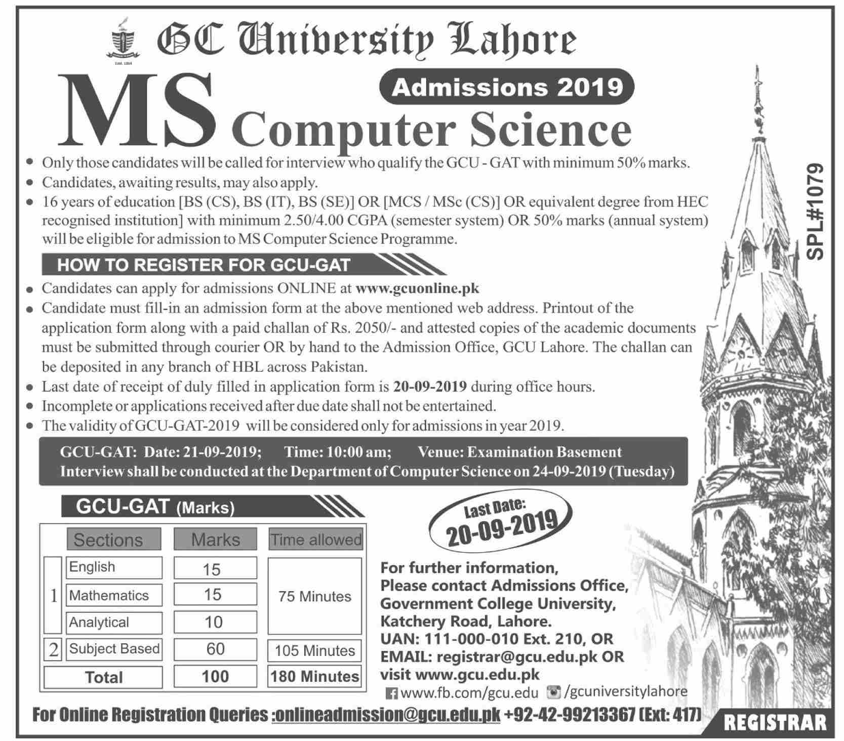 GC University Lahore has announced admissions for MS in Computer science. Last date for submission of admission applications 20 Sep 2019. Entry test will be held on 21 Sep 2019.