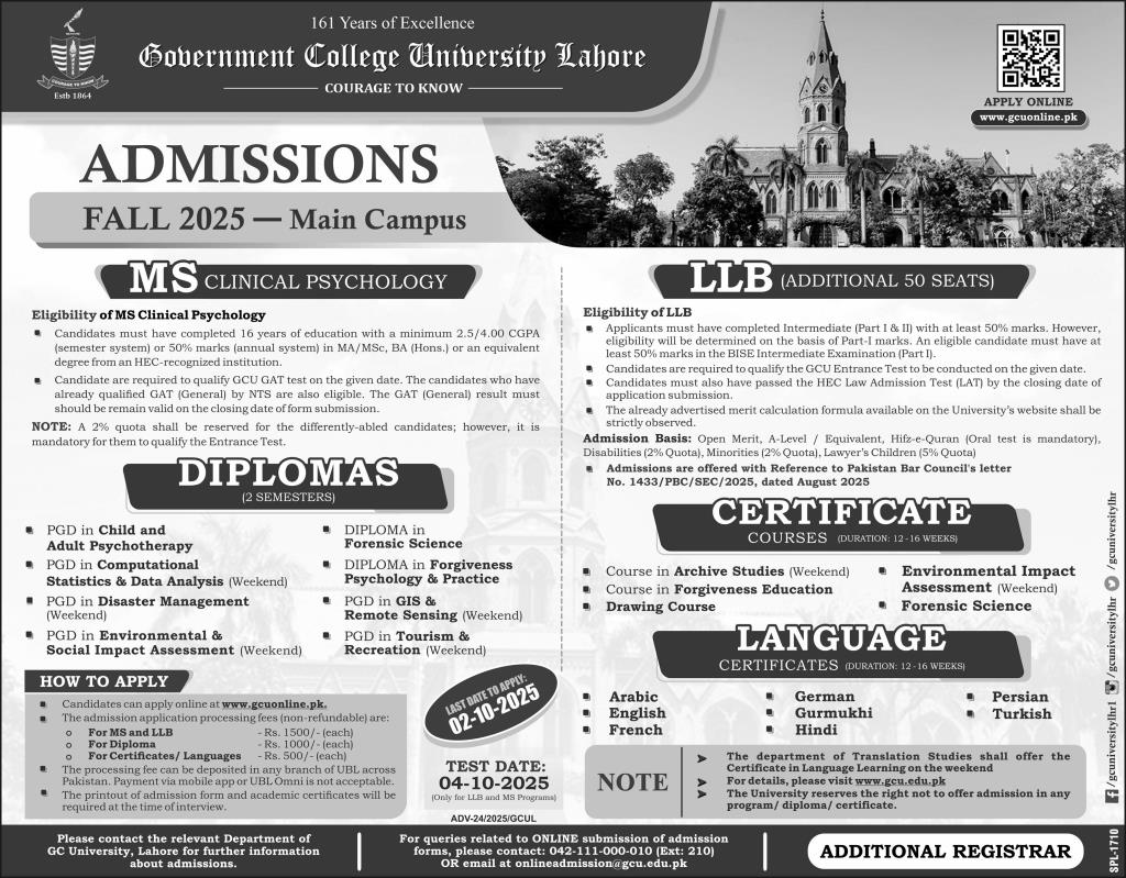Government College University GCU Lahore—one of Pakistans most prestigious institutions with a legacy spanning over 161 years—is now accepting Fall 2025 applications for a wide range of programs, including MS, LLB, Postgraduate Diplomas, Diplomas, and Certificate Courses.
