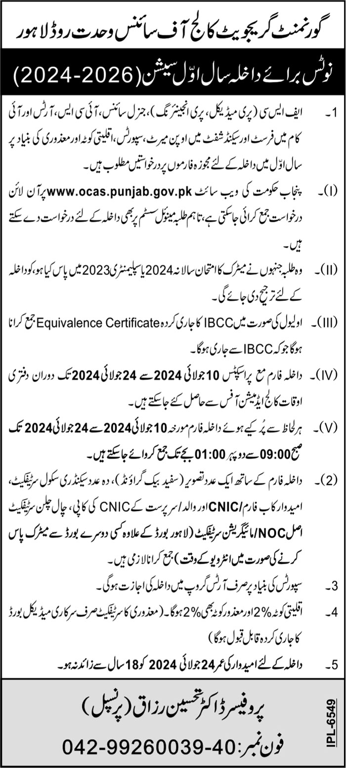 Government Graduate College of Sciences GGCS is pleased to announce GGCS Admissions 2024 for various programs in both first and second shifts. The college offers a range of programs designed to cater to diverse academic interests, including FSC Premedical, FSC Pre-Engineering, General Science, ICS, and I.COM.