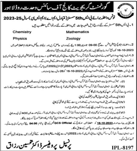 Government Graduate College of Science, Wahdat Road, Lahore, is pleased to announce admissions for the 5th Semester Alternate MA/MSc for the academic year 2023-25. This is an excellent opportunity for aspiring students to pursue their education in various science disciplines, including Mathematics, Zoology, Chemistry, and Physics.