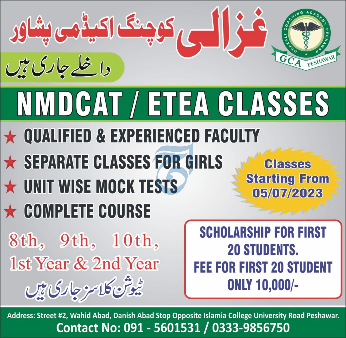 Ghazali Coaching Academy is thrilled to announce the commencement of admissions for the year 2023. Offering a wide range of coaching classes, including MDCAT/ETEA, 8th, 9th, 10th, 1st Year, and 2nd Year, the academy aims to provide quality education and guidance to students at every level. With a team of experienced and dedicated faculty members, Ghazali Coaching Academy ensures a nurturing learning environment for students to excel academically. The classes are set to begin on 05 July 2023, providing ample time for students to prepare and maximize their potential. Dont miss this opportunity to secure your admission 2023 and embark on a journey towards success with Ghazali Coaching Academy.