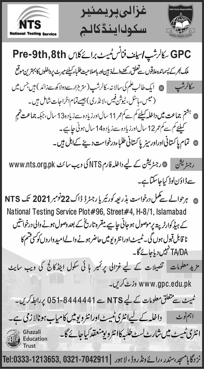 Ghazali Premier School & College Lahore opens Admissions and offering Applications to Aspirants for granting Admissions in class Pre-9th, 8th through GPC Scholarship/ Self Finance Test. This is golden opportunity for deserving and brilliant students. Students will be able to continue their studies without bearing studies expenses. Hostel facility will be given to selected candidates. Students from Pakistan and Overseas can apply to avail this opportunity. Test will be conducted through NTS. Last date of Receipt of Application for Admission is November 22, 2021. Candidates may apply, Registration is ongoing.