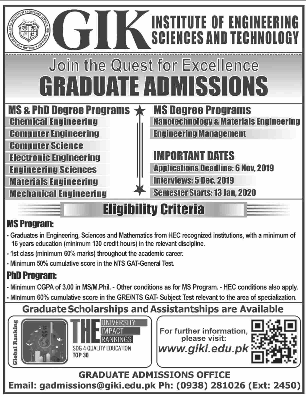 GIK Institute of Engineering Science & Technology Swabi has announced admissions for MS/PhD program in Chemical Engineering, Electrical Engineering, Computer Engineering, Computer sciences, Electronic Engineering, Materials Engineering. Scholarships are available.