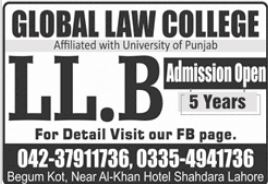 Global Law College Lahore has announced admissions for 5 year LLB Program. Affiliated with University of Punjab. For detail visit our FB page. Admissions are open.