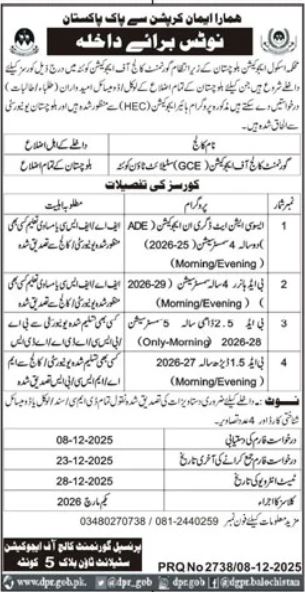 The Government College of Education GCE, Satellite Town, Quetta invites applications for admission to various teacher education programs for the upcoming academic sessions. The college is operating under the School Education Department, Government of Balochistan.