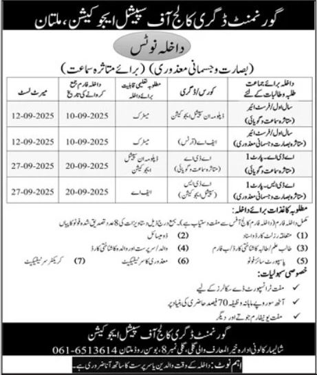 The Government Degree College of Special Education, Multan invites applications for admission in various special education programs for the academic year 2025–2026. These programs are designed specifically for students with hearing, speech, visual, and physical impairments, ensuring an inclusive and supportive learning environment.