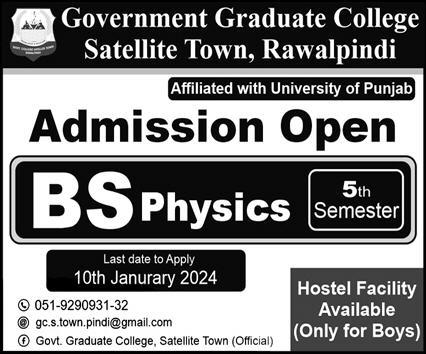 Aspiring students interested in pursuing their BS Physics degree at Government Graduate College Satellite Town are encouraged to apply. The deadline for applications is set for the 10th of January 2024. To start your educational journey at this esteemed institution