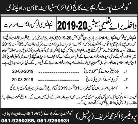 Government Post Graduate College boys Satellite Town Rawalpindi is announced admissions 2019-20 in M.Sc Physics,M.A Islamiyat.
