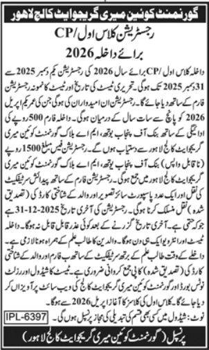 Government Queen Mary Graduate College, Lahore is inviting applications for admission 2025-26 to Class 1 / CP. The registration process is as follows:
