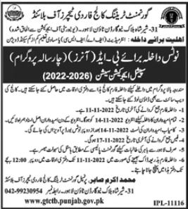 Government Training College for the Teachers of Blind admissions 2022 for the BEd Honor Program in Lahore. The eligibility criteria for the course are intermediate with FA, FSc, or in an equivalent field with second division. Admissions forms can be obtained from the official website of the Government Training College for the Teachers of the Blind or from the office by visiting in person. The last Date for the submission is 11-11-2022