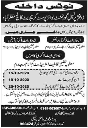 Govt Boys Postgraduate College Muzaffarabad is offering admissions 2020 in Associate Degree Program Science, Associate Degree Program Commerce, Associate Degree Program Arts. Last date to apply is 15 October, 2020.