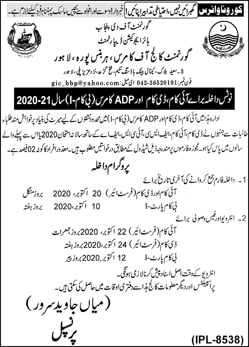 Government College of Commerce has announced admissions 2020 in I.Com, D.Com, ADP Commerce, B.Com Part I in Lahore, Punjab.