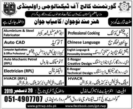 Govt College of Technology Rawalpindi has offered admissions for Free Short Courses in Professional Cooking, Chinese Language, Auto CAD, Electrician, English Language & Personality Grooming, Auto Mechanic Petrol, HVACR, Computer Applications & Office Professional. Last date for submission of admission applications is 20 Dec 2019.