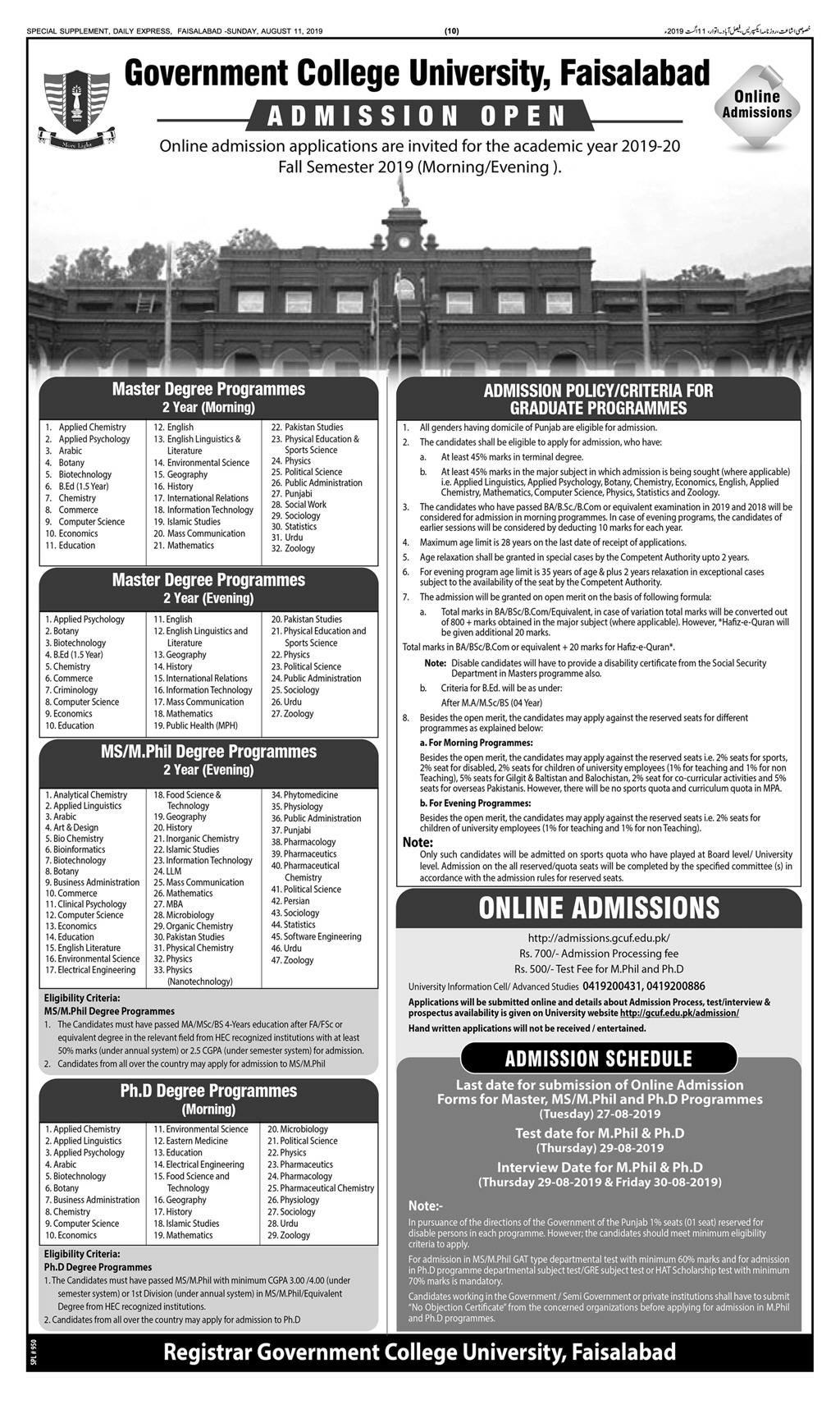 Govt. College University MA MS/M.Phil admissions 2019