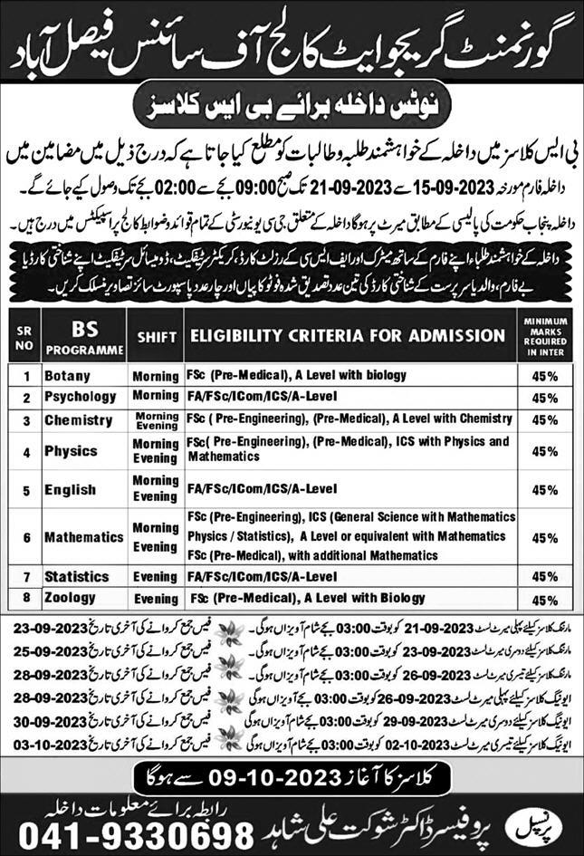 Faisalabad, September 12, 2023 – The Government Graduate College of Science in Faisalabad has officially announced its admission process for Fall 2023, spanning both morning and evening shifts. This prestigious institution offers a wide range of undergraduate courses, including BS in Botany, Psychology, Chemistry, Physics, English, and Zoology.