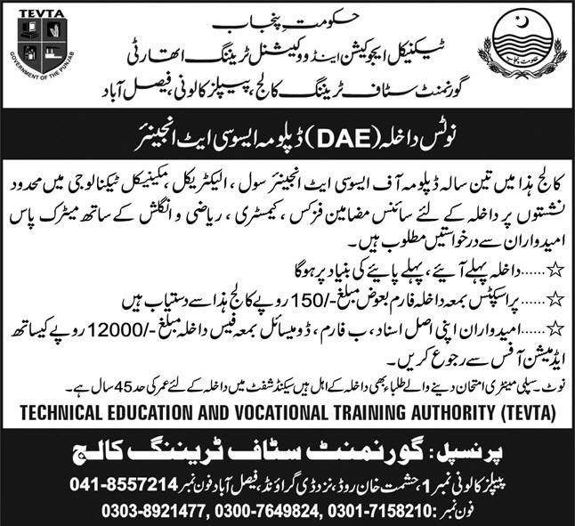 Govt Staff Training College invites the application forms for for Diploma of Associate Engineer in Civil, Electrical, Mechanical Technology in Faisalabad. For second shift admission eligibility criteria in age wise is candidate not greater than 45 Years.