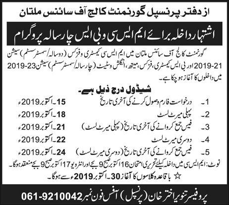 Govt.College of Science Multan has announced admissions for BS in Chemistry, Physics, Mathematics, English, Statistics, MSc in Chemistry, Physics. Last date to apply is 15 Oct 2019. Merit list will be displayed on 18 Oct 2019.