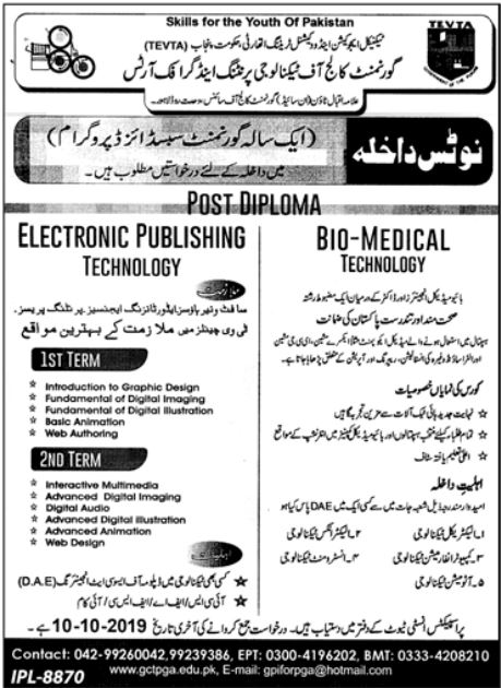 Govt.College of Technology Printing & Graphic Arts Lahore has offering admissions for 1 year Govt. Subsidized Program for Post Diploma in Bio-Medical Technology, Electronic Publishing Technology. Last date for submission of admission application 10 Oct 2019.