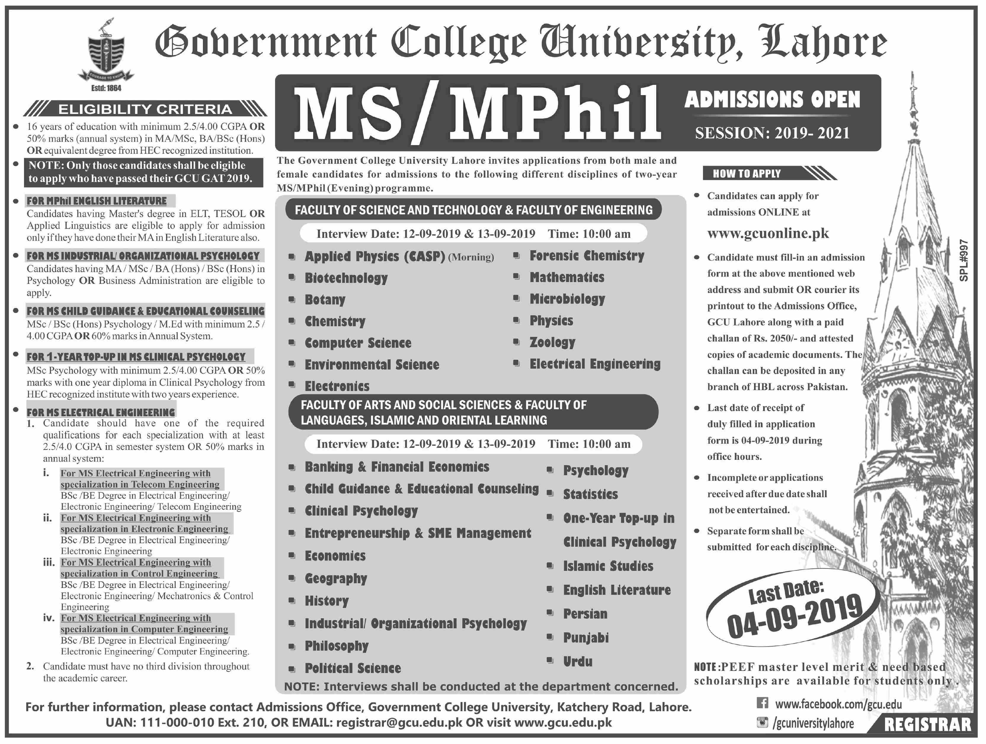Govt.College University Lahore has announced admissions for MS/M.Phil in Chemistry, Zoology, English, Botany, Physics, philosophy, Political science, Geography, History, Mathematics. Last date for submission of admission applications 04 Sep 2019. Scholarships are available.