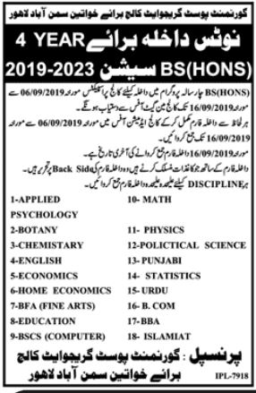 Govt.Post Graduate College Lahore has announced admissions for BS in Applied Psychology, English, Physics, Computer science, Chemistry, Botany, Economics, Islamyat, Education, Urdu, BBA, B.Com. Last date to apply 16 Sep 2019.