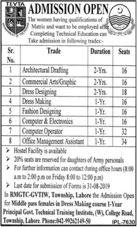 Govt.Technical Training Institute for Women Lahore has announced admissions for Diploma courses in Commercial Arts/Graphics, Dress Designing, Dress making, Fashion Designing, Computer & Electronics, Computer Operator, Office Management Assistant. Last date for submission of admission application is 31 Aug 2019.