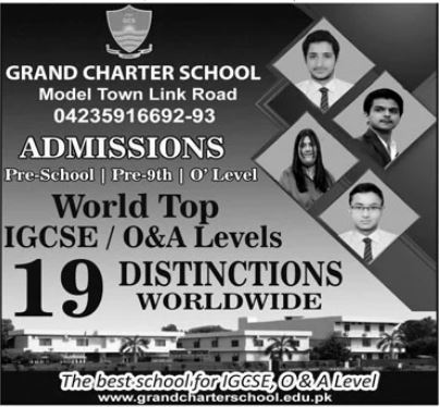 Grand Charter School GCS, located on Model Town Link Road, is now open for admissions for the 2024 academic year. Renowned for its world-class education, GCS offers programs for Pre-School, Pre-9th, and O Level students. As one of the best schools for IGCSE and O&A Levels, GCS stands out with a remarkable record of 19 distinctions worldwide.