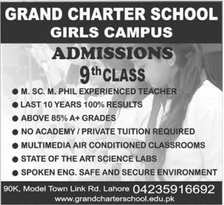 Grand Charter School is decided to open Grand Charter School Admissions 2022 and looking for applications for Grand Charter School Admissions 2022 for class 9th. Grand Charter School Class 9th Admissions 2022 are announced for Sessions 2022. Students will be educated under supervision of well educated and experienced teachers in best learning environment. Scholarships will be awarded to intelligent students. Grand Charter School Lahore Admissions 2022 are open now.
