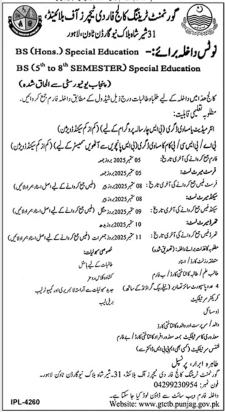 Government Training College for Teachers of the Blind, Lahore admissions 2025 open for the following degree programs affiliated with the University of the Punjab: